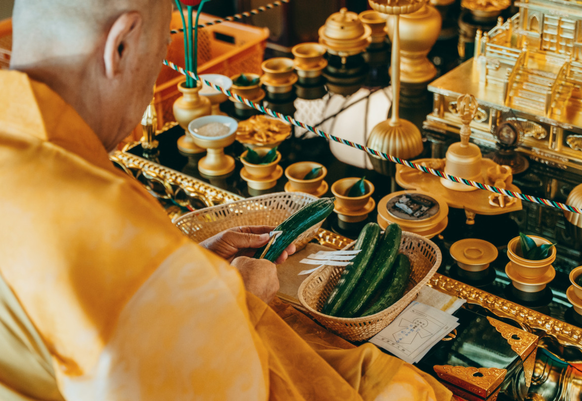 本堂中央には御前立本尊として弘法大師立像、その両脇に阿弥陀如来立像、十一面観音菩薩立像が祀られ、奥院には秘仏本尊の虚空蔵菩薩坐像が安置されています(大晦日の晩から正月三が日のみ公開)。年間を通じてさまざまな儀式が行われますが、なかでも毎年7月21日に行われる、きゅうりに病気を封じ込めて平癒を祈る「胡瓜加持」はその珍しさも手伝って、多くの参拝客が訪れます。