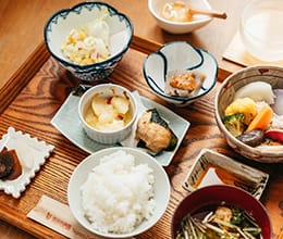 高鴨神社に隣接するお蕎麦屋さんです。地元の水で打つ本格手打ち蕎麦は、風味豊かでのどごし抜群。天井が高く広々とした店内の大きな窓からは高鴨神社の池が見え、四季の移ろいを味わえます。蕎麦ができるまでの待ち時間や、食事の後には、お店の奥にある文化館へどうぞ。御所市の歴史・文化が紹介されており、足元に御所全域の大きな地図があります。御所という土地を、より身近に感じてもらえたらうれしいです。お腹も心も満たされたら、タクシー(サンキュータクシー:0745-62-3939)で帰路へ。