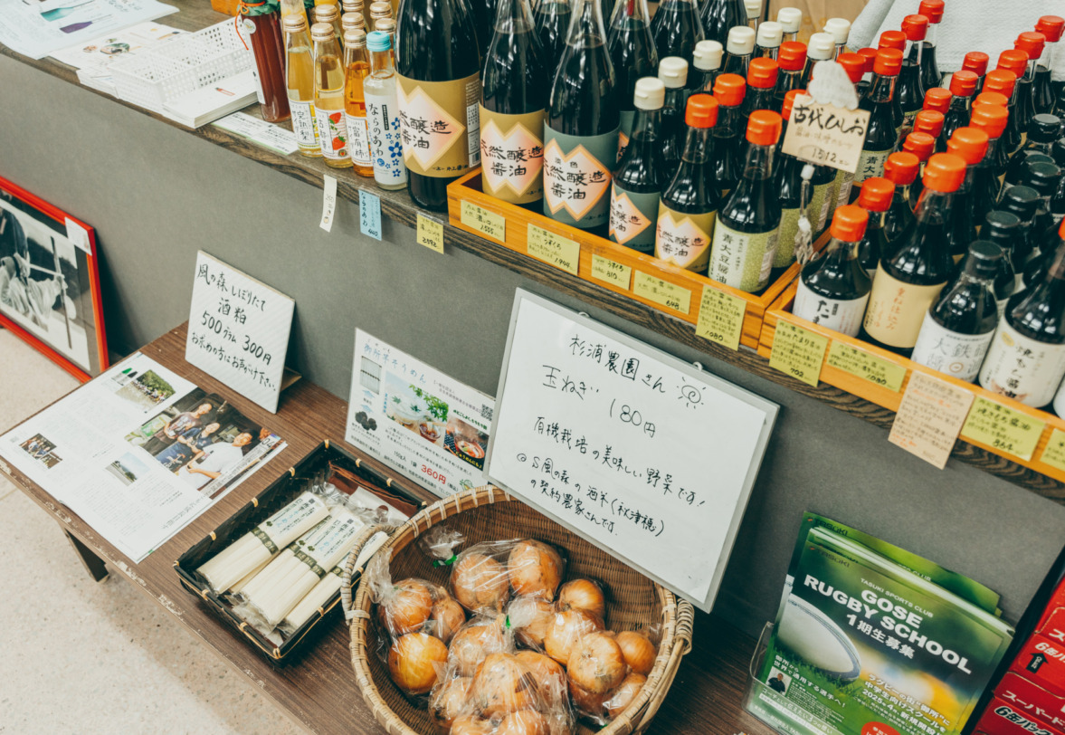 創業当時は升での量り売りをしていたり、幅広い銘柄の瓶酒を取り揃えて販売したりとされてきましたが、時代と共にお店の在り方も変化してきました。先代店主からお店を引き継いだ宣子さんはあるとき、すべての商品に責任を持ち、それぞれの特徴をしっかりと理解して説明できるようにと、種類を減らすことを決断。売れ筋をみながら商品を吟味していく中で、自然と地元酒造のものに絞り込まれていったそうです。現在は地酒に加え、早希子さんおすすめの県内産クラフトビールやワインなども一部販売。また、杉浦農園の野菜や片上醤油など地域の産品も販売し、地酒と共に御所の魅力を発信しています。