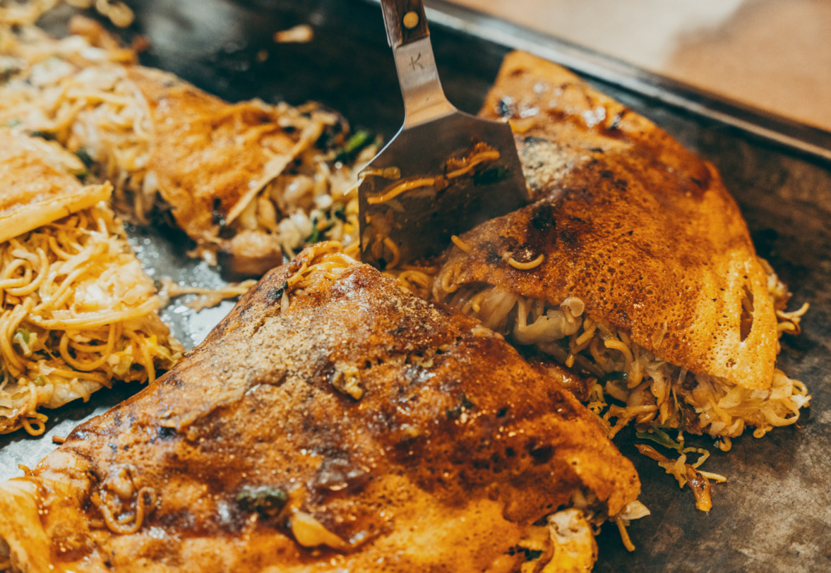 基本の具材は干しえび・キャベツ・ねぎ。そこに自家製の油かすを加え、独特の食感と風味で素材のおいしさを引き立てます。また鉄板に引く油にも自家製調味油を使用し、生地に旨味と香ばしさをプラスしています。