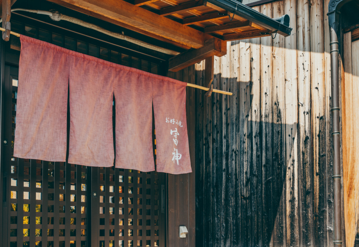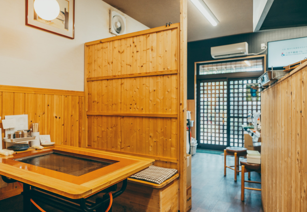 「富神(ふうじん)」は2020年、和食料理の店「來神(らいじん)」の姉妹店としてオープンしたお好み焼き店。茜色の暖簾をくぐり中に入ると、店内に広がる香ばしい匂いと生地が焼けるジュージューという音が食欲をくすぐります。木がふんだんに使われた店内には、鉄板が埋め込まれたテーブル席が3つ。それぞれ壁で仕切られ、グループごとにゆったりと寛げるつくりになっています。
