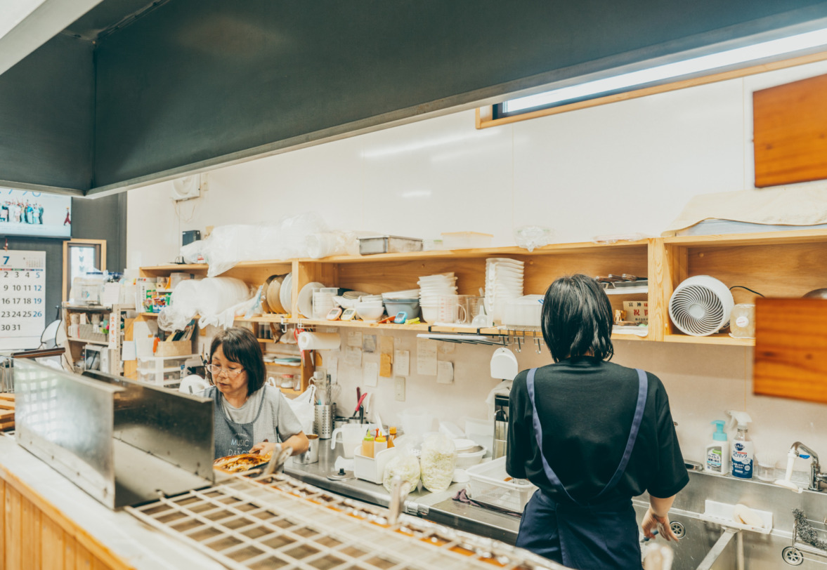 お好み焼き・洋食焼き・焼きそば・とんぺい焼きなど、品書きには30種以上の粉もんメニューがずらり。その中でも一番人気は、ボリューム満点のモダン焼きです。豚・てっちゃん・イカ・えび・ミックスの中からメインの具材を選び、そばかうどんを選んで注文。しばらくすると、もっちりとした薄焼きの生地から溢れんばかりの具材が顔をのぞかせる、半月型のモダン焼きが運ばれてきます。オープン当初はもう少し小ぶりだったそうですが、「焼いてるうちにだんだん大きくなっちゃって」と笑うのは店主の宮橋さん。食べきれず持ち帰るお客さんもいるなかで、おいしさのあまり一人で2つ完食した強者もいるのだとか。